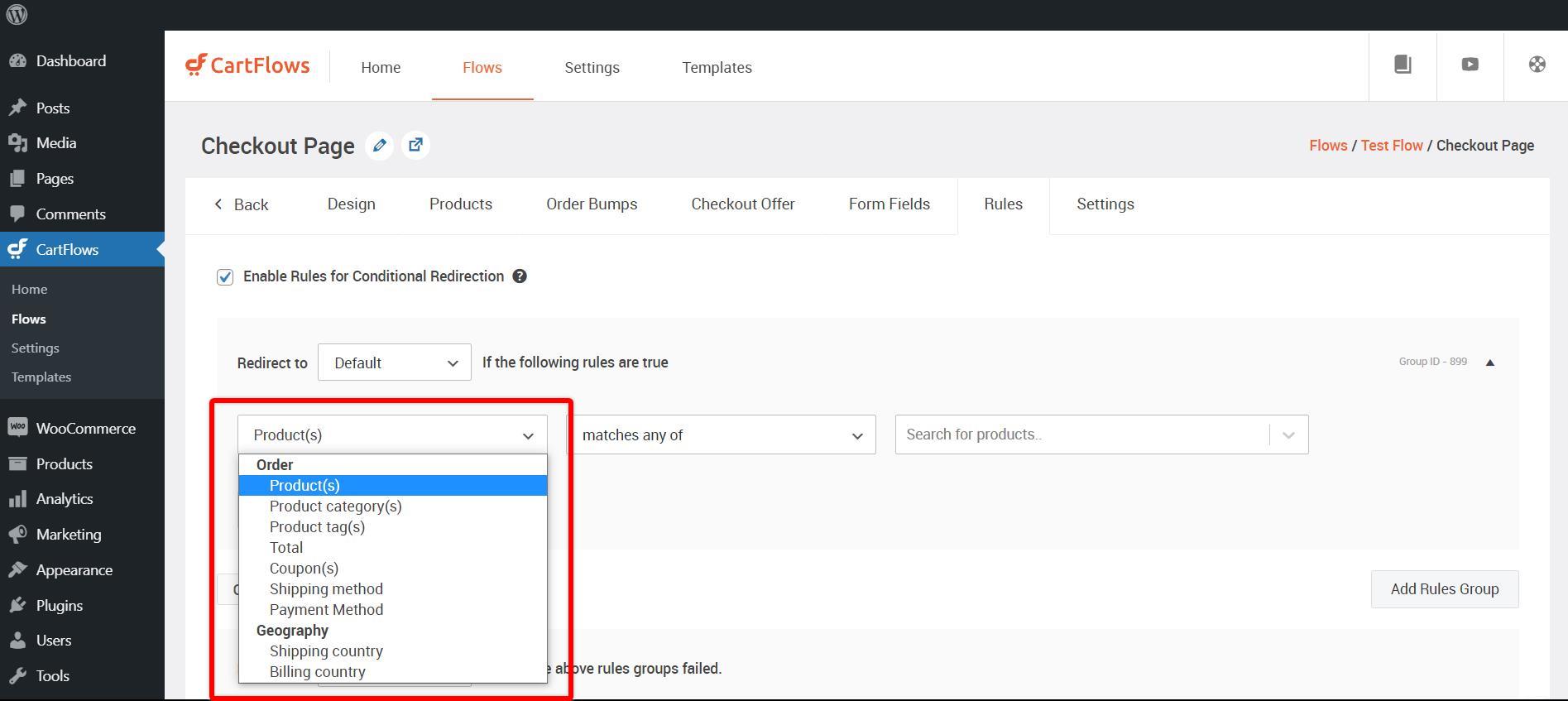 Using this feature, you can set the custom redirect conditions on the checkout page to display the upsells/downsells on the basis of conditions.