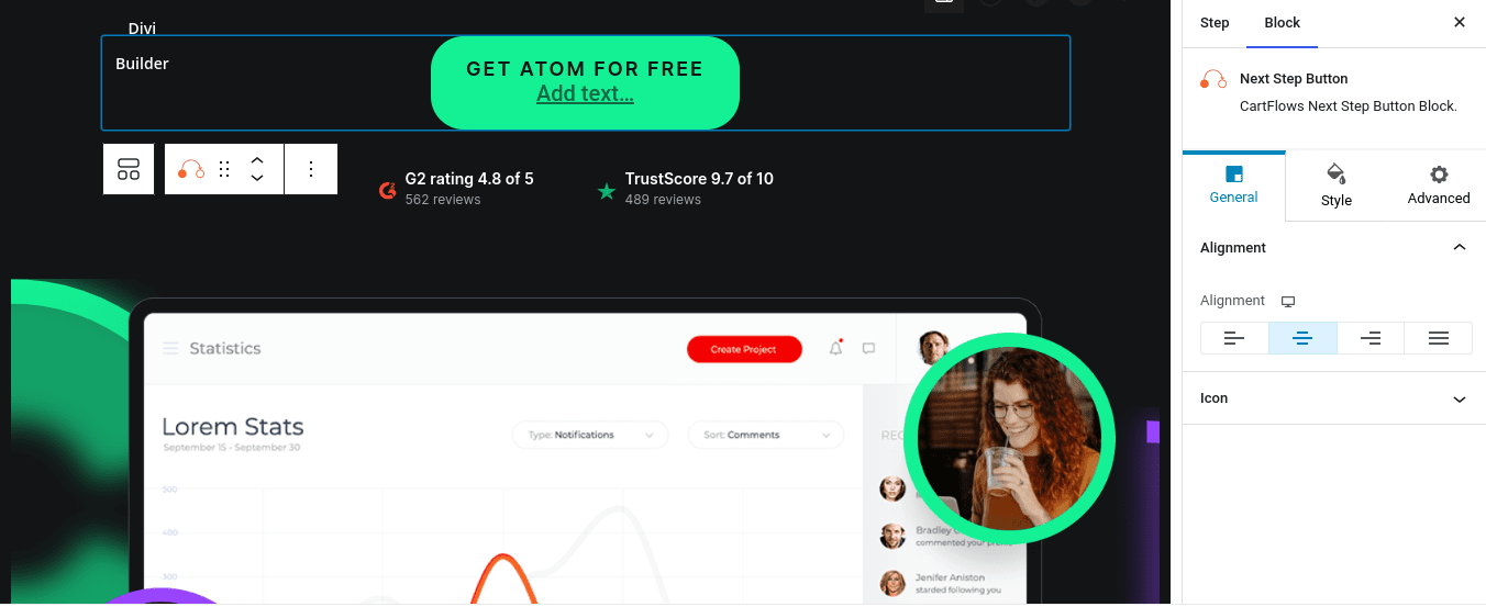 # Settings in General Tab: In this section, we will have the settings to change the alignment of the block and text as well as you can add the icon to the block. [ Screenshot ]