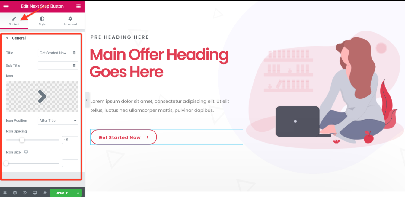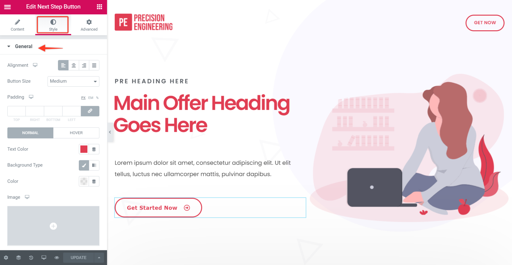 # Setting in Style Tab: There are two tabs one is General & Content in which you will get all the designing options to design the button/link.