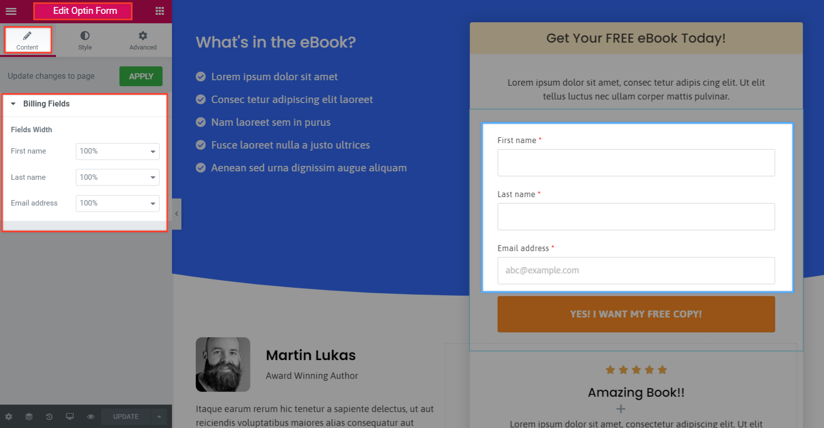 # Setting in Content Tab: In this section you will get the text and width setting of the optin fields.