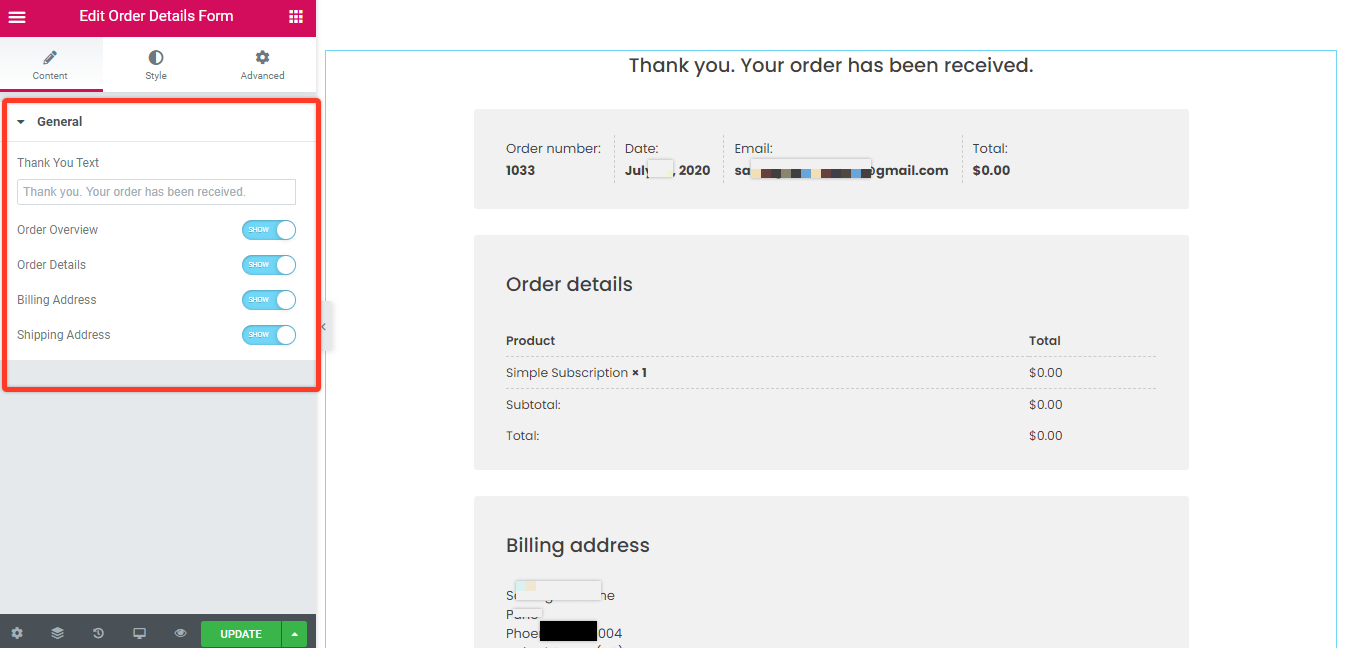 - Using this widget you can design setting as well as you can enable/disable the sections which are displayed in the thank you page order review form