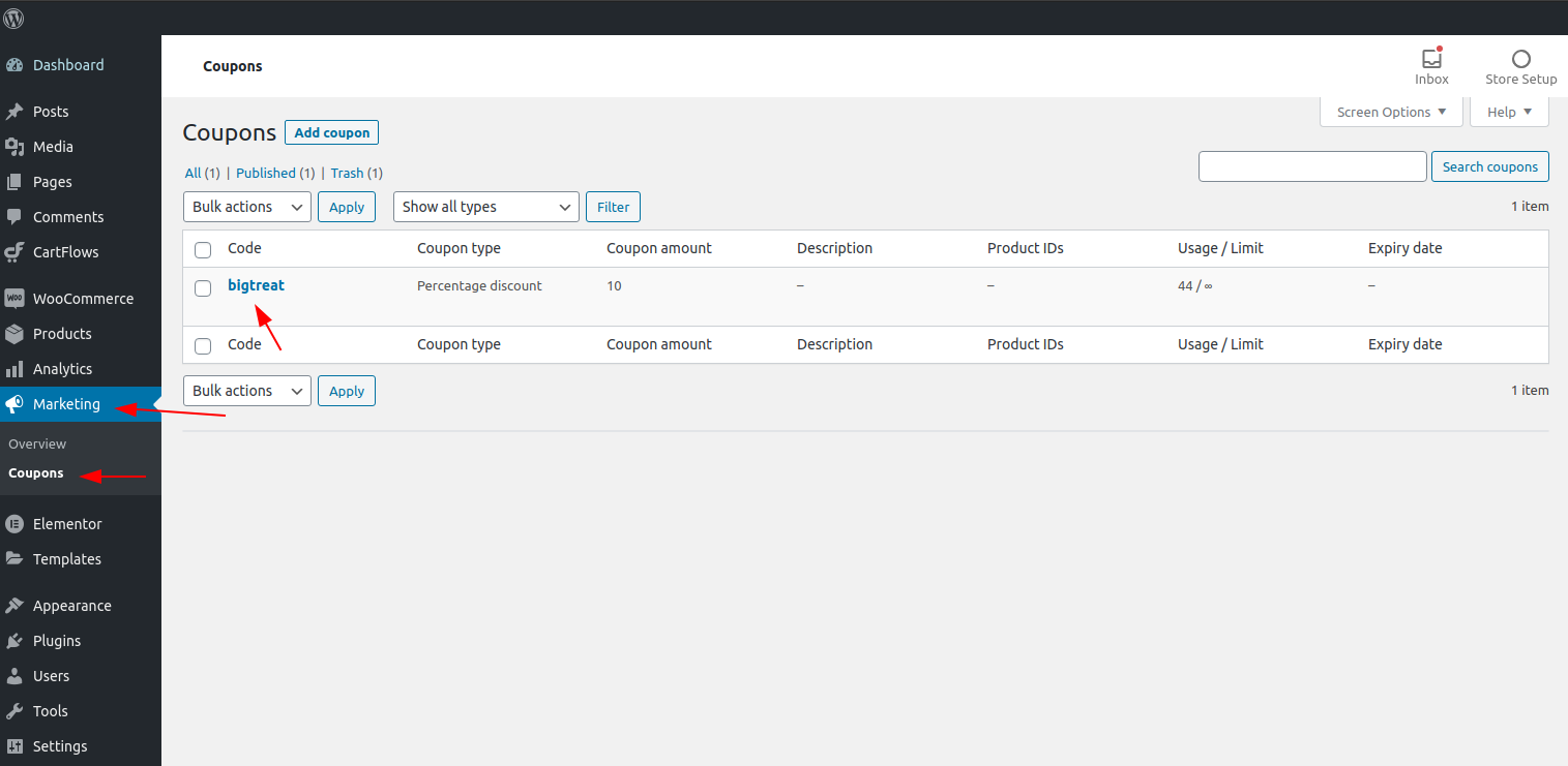 - Create a coupon in the WooCommerce’s Setting. This article will help you to create a coupon.