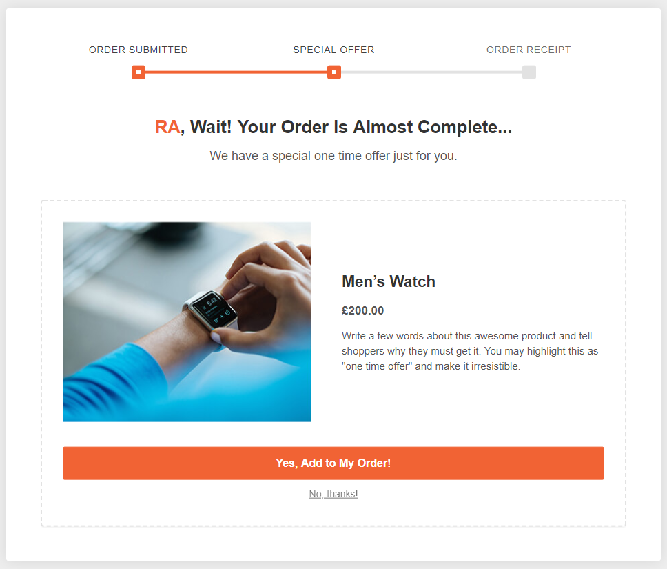 You can enable Checkout Offer if you want to offer a product or another related product to get your customers to buy more stuff before the payment is made. No matter which option they choose, yes or no, the order made is automatically processed.