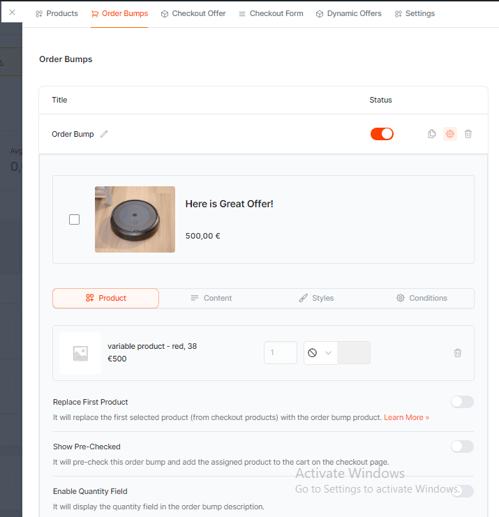 If you want to add order bump to your checkout page, you can simply configure it in the Order Bump menu by clicking the corresponding order bump settings.