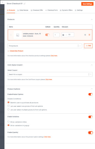 This is where you add the product you would like to link to your checkout page. You can also add a coupon if you’re running a promotion for your product. Make sure that you enable coupons in the WooCommerce settings. Here, you can also configure restrictions, variations, and enable quantity.