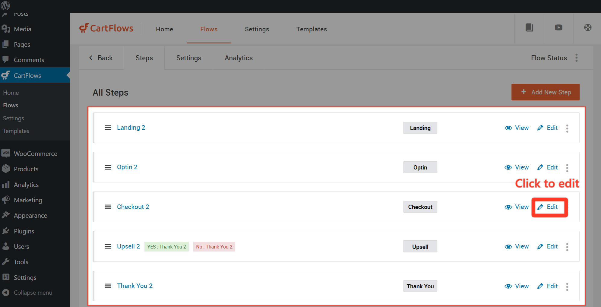 Step 1: Go to CartFlows -> Flows -> Your Flow