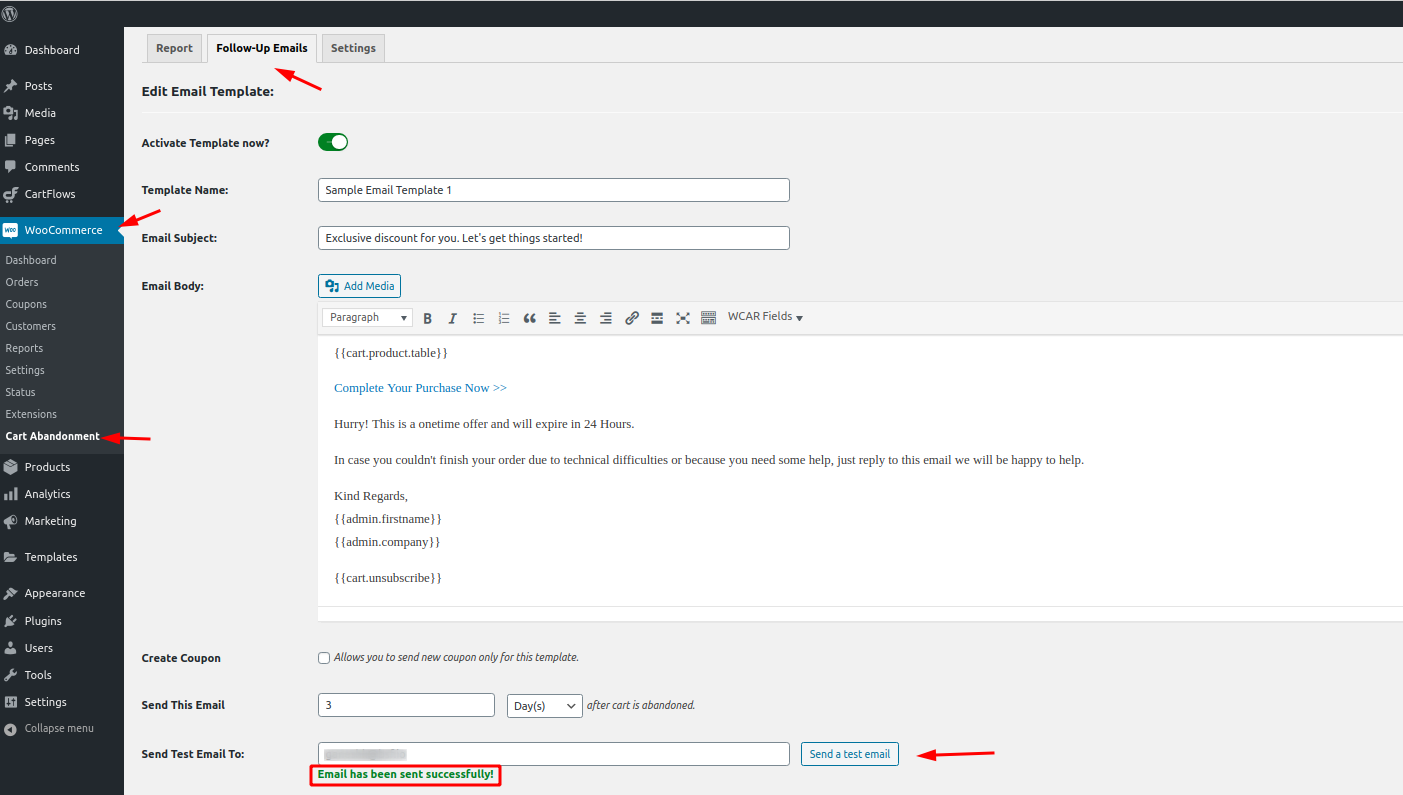 Follow-ups emails are the automated series of recovery emails set in the plugin. When any order gets abandoned, emails are scheduled according to the time set for emails. At the scheduled time the emails will be sent to the respective customers.