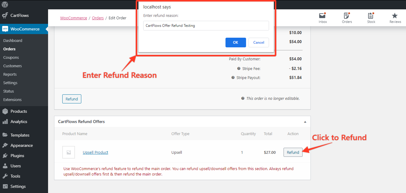 After successful completion of the refund, a popup will be displayed and an Order Note will be added in the respective order notes.