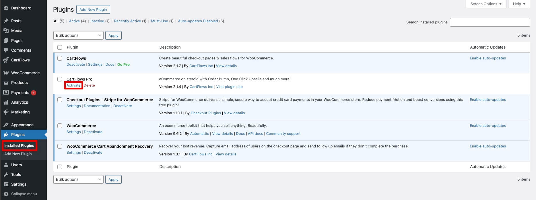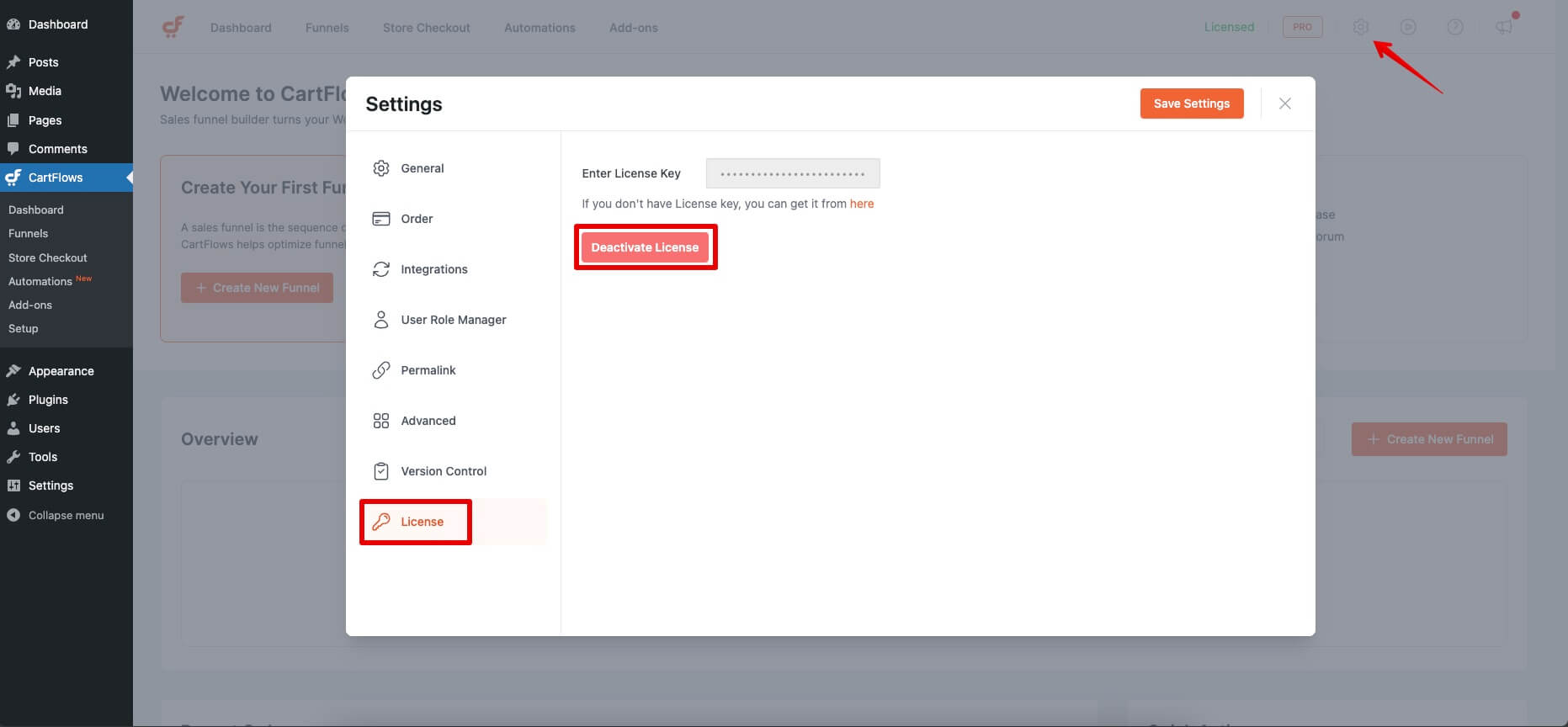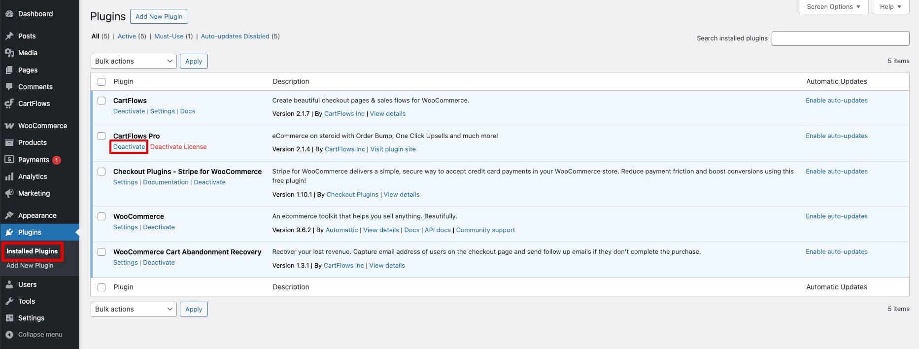 > Navigate to Plugins and deactivate CartFlows Pro.