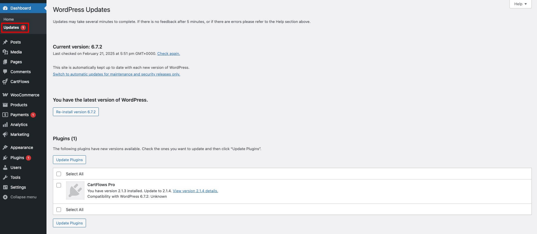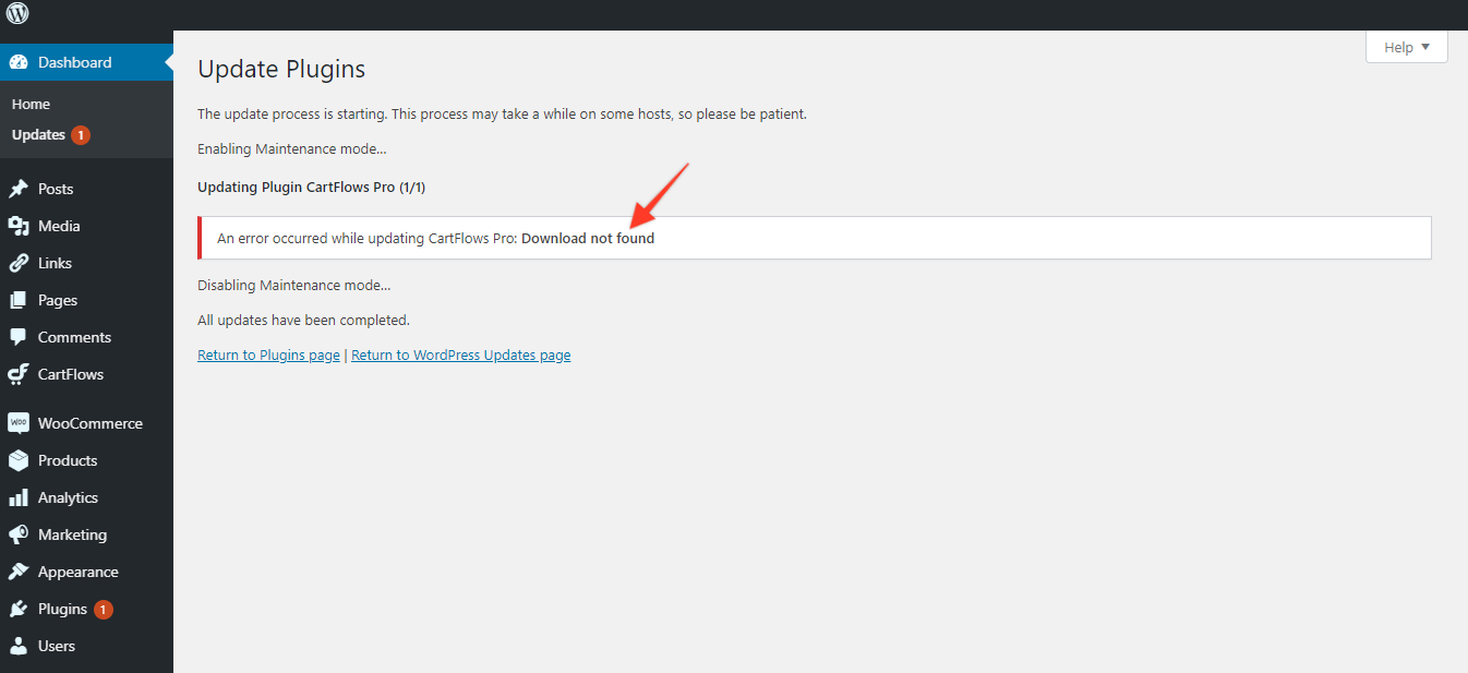 If you see the error message “CartFlows Pro: Download not found.” while updating the plugin, follow the steps below to resolve the issue.