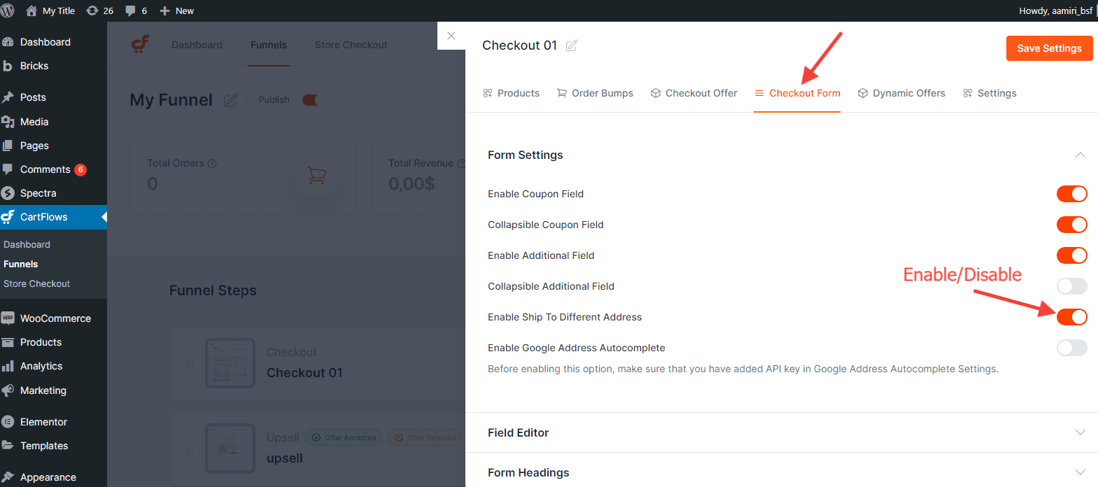 Step 3: Navigate to the Checkout Form tab and switch on the “Enable Ship to Different Address” toggle.