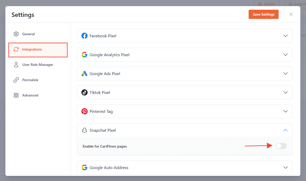 Step 2: Scroll down to the Snapchat Pixel Settings and enable the option – Enable for CartFlows pages.