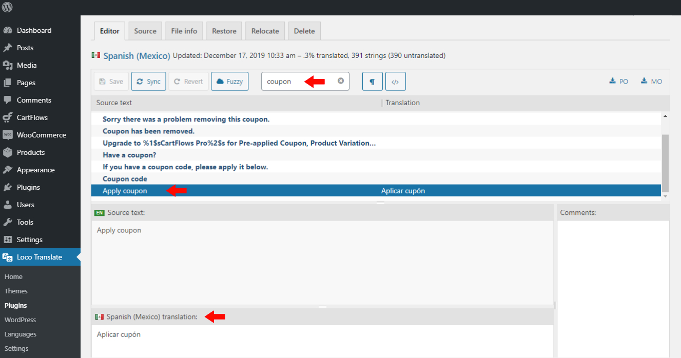 Step 4: Now search for the Coupon or any Strings of the CartFlows you need to translate and add the Translated String in the bottom Translation section and Save.
